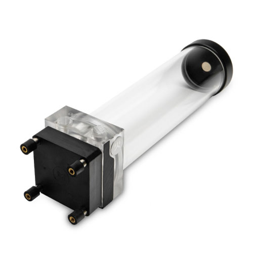 The main body features two G1/4 threaded ports of which one is an inlet (in the reservoir) and one is an outlet (from the pump). The reservoir tube is made of quality cast acrylic material.