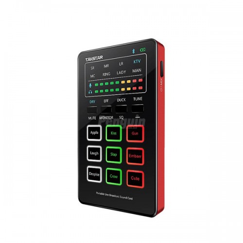Takstar MX1 mini Portable Webcast Sound Card comes with a Portable design tailored for the mobile webcast, Plug and play, free webcast, Stereo sound, low delay. This Sound Card is built-in DSP, 9 kinds of sound effects, quick switching, easy to operate. Here, Mic HFLF adjustment for various vocal and mic sounds. In this sound card, just press one button to switch singing mode to chatting mode, Press one button for autotune, 12 autotunes for accurate and easy singing as well as Press one button for ducking function also. The sound card provides you Nine host sound effects to promote a funny atmosphere and also the Bluetooth function playing music without the trouble of cable connection. Here used Smart noise-reducing to shield picking up ambient noise for pure singing. This sound card also has a Li-ion battery, that provides around 7h operation time, charging during operation.n The new Takstar MX1 mini Portable Webcast Sound Card has no warranty.