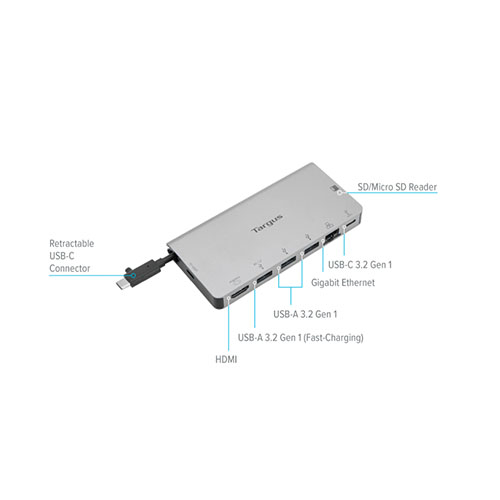 The Targus DOCK414AP USB-C Travel Docking Station With 3 USB-A 3.2 Gen 1 ports (1 fast-charging) and 1 USB-C 3.2 Gen 1 port, you can increase your productivity and connect to additional devices. This slim and light dock is ideal for use at home, the workplace, or anywhere in between. Excellent for mobile personnel as well as those who work in hotels or hot-desking environments.